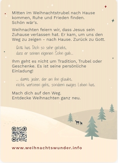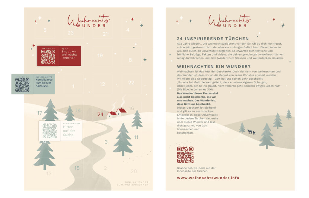 Mit dem Weihnachtswunder-Adventskalender wollen wir euch die Möglichkeit geben in eurem Umfeld Menschen durch klare evangelistische Impulse rund um die Themen Advent und Weihnachten zum Weiterdenken herauszufordern.