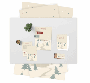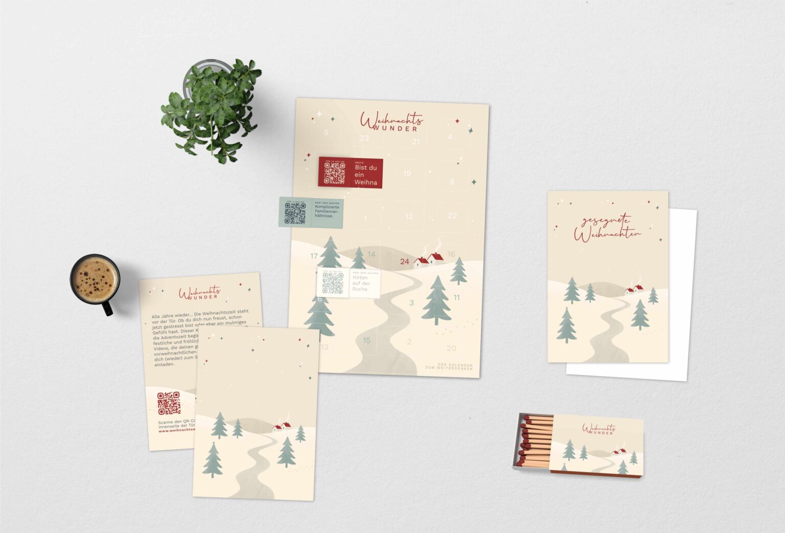Neben dem Adventskalender bieten wir 3 zusätzliche Produkte an: eine Postkarte – „Gesegnete Weihnachten“, Streichhölzer und eine Verteilkarte.